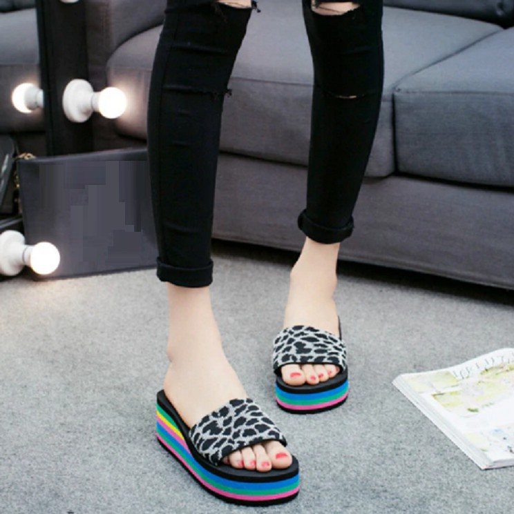 Estas pantuflas de leopardo sobre una plataforma colorida son de muy alta calidad y elegantes.