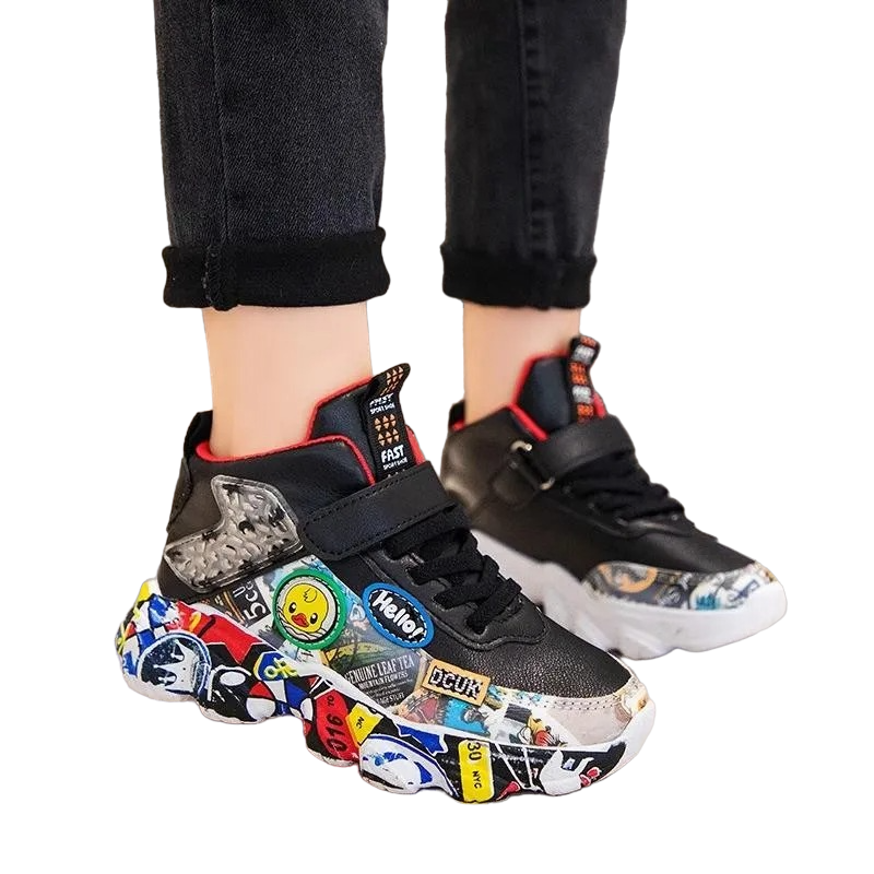 Estas zapatillas son la elección ideal para los padres que buscan calzado estiloso y funcional para sus hijos. El diseño exclusivo de graffiti añade un aspecto moderno y juvenil a las zapatillas, mientras que los materiales transpirables y duraderos aseguran comodidad y resistencia. La suela flexible y el cierre fácil son otras ventajas que hacen de estas zapatillas una opción práctica para el uso diario. No solo son prácticas, sino también modernas, lo que las convierte en una elección favorita para los chicos activos.
